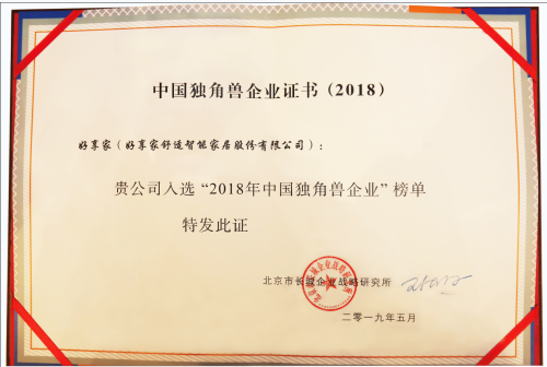 2019年5月9日,长城企业战略研究所在京发布《2018年中国独角兽企业发展报告》,作为中国领先的舒适智能家居集成服务商,五星控股集团旗下企业好享家以10.2亿美元估值荣登2018中国独角兽企业榜单,成为舒适智能家居行业首个全国独角兽企业。