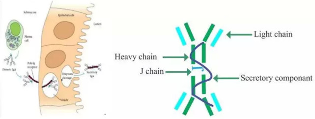 (4)粘膜免疫主要效应分子是sIgA。血液中IgA分子以单体形式存在,而粘膜下的sIgA是由分泌片将两个IgA分子连接形成二聚体,并由粘膜上皮细胞转送到肠道或呼吸道,“标记”抗原,参与外来病原体的中和及清除过程,可更快速和有效地捕捉病原体在粘膜的黏附、入侵。sIgA 产生机制及其结构见下图: